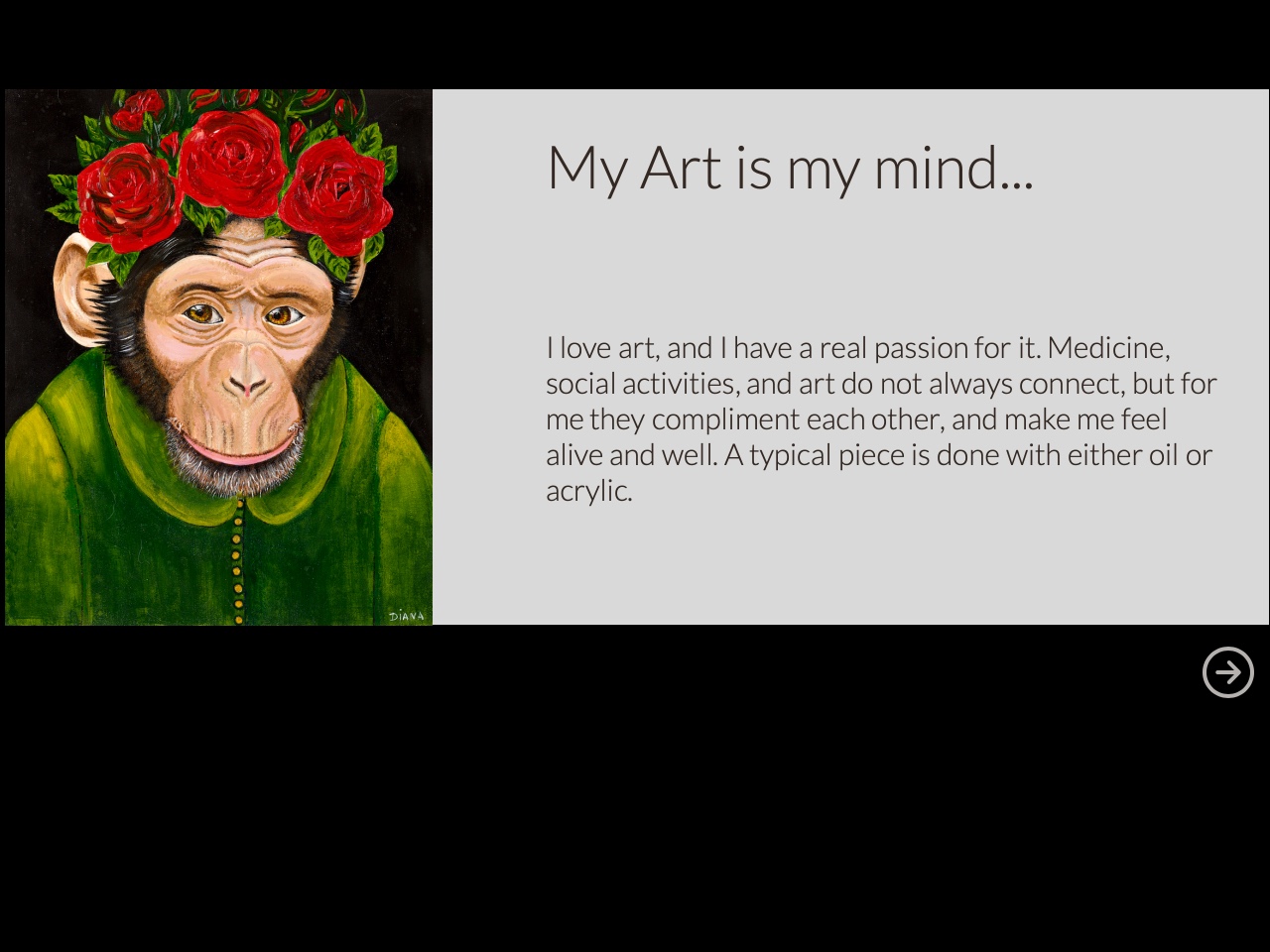 I love art, and I have a real passion for it. Medicine, social activities, and art do not always connect, but for me they compliment each other, and make me feel alive and well. A typical piece is done with either oil or acrylic. My Art is my mind…