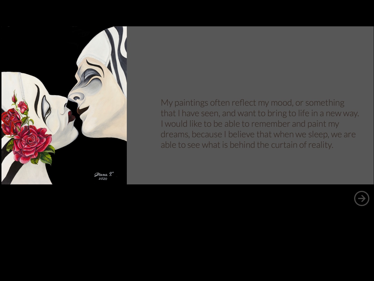 My paintings often reflect my mood, or something that I have seen, and want to bring to life in a new way. I would like to be able to remember and paint my dreams, because I believe that when we sleep, we are able to see what is behind the curtain of reality.