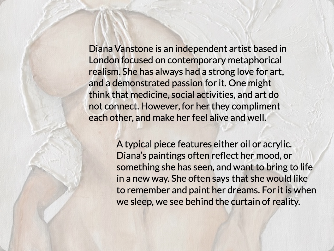 A typical piece features either oil or acrylic. Diana’s paintings often reflect her mood, or something she has seen, and want to bring to life in a new way. She often says that she would like to remember and paint her dreams. For it is when we sleep, we see behind the curtain of reality.Diana Vanstone is an independent artist based in London focused on contemporary metaphorical realism. She has always had a strong love for art, and a demonstrated passion for it. One might think that medicine, social activities, and art do not connect. However, for her they compliment each other, and make her feel alive and well.